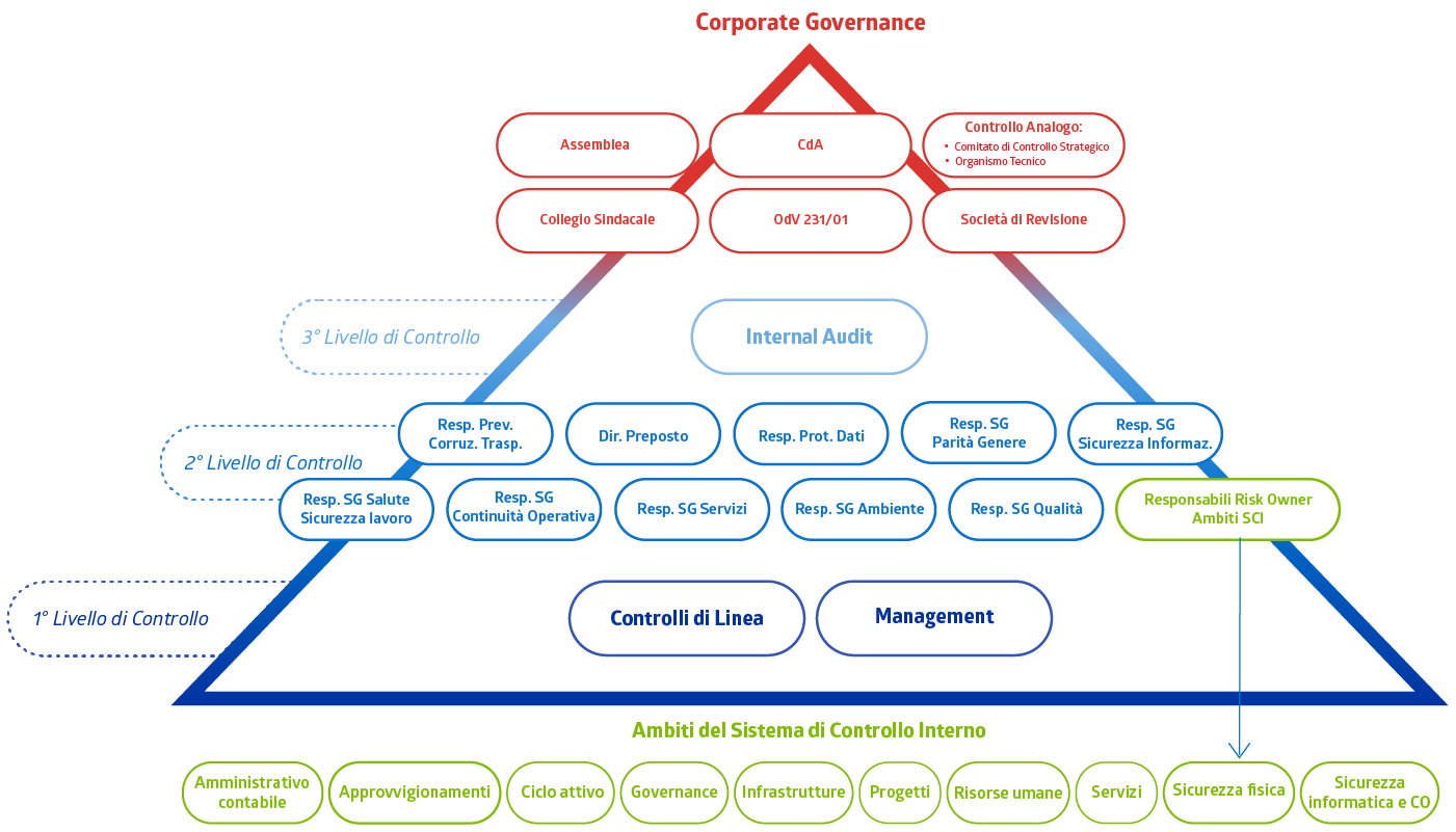 Il Sistema di Controllo Interno (SCI) è l'insieme delle regole, delle procedure e delle strutture organizzative volte a consentire l'identificazione, la misurazione, la gestione e il monitoraggio dei principali rischi aziendali; è sviluppato su 3 linee di difesa e suddiviso in specifici ambiti, per ognuno dei quali è identificato un Responsabile/Risk Owner.